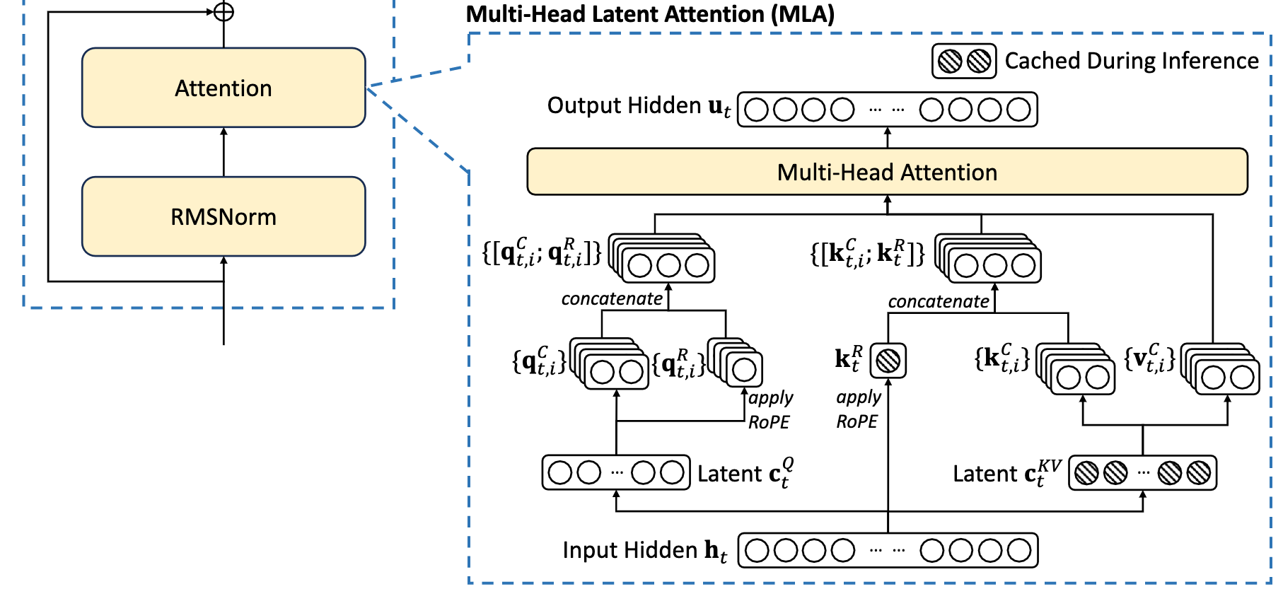 - Key: Contains the multi-head part without RoPE ($\boldsymbol{c}_i \boldsymbol{W}_{kc}^{(s)}$, up-projected from $\boldsymbol{c}_i$) and the shared part with RoPE ($\boldsymbol{x}_i \boldsymbol{W}_{kr} \boldsymbol{\mathcal{R}}_i$, generated directly from the input).